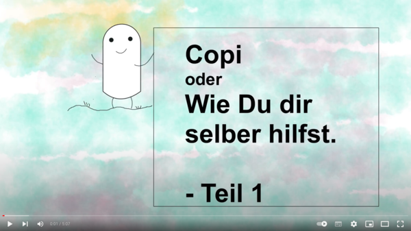 Copi (Teil 1) ist ein Erklärvideo über Stress und Stressverarbeitung im Gehirn. Es nimmt auch dysfunktionale Stressverarbeitung in den Blick. Das Video ist Teil eines größeren Projektes der Schulsozialarbeiterin Julia Bethlehem, zu dem mehrere Videos, sowie Material für Eltern und Lehrkräfte gehört.. Ziel ist es, Kinder – vor allem auch traumatisierte Kinder – bei ihrem Stresscoping zu unterstützen und Situationen zu minimieren, in denen Kinder ausrasten müssen und sich nicht regulieren können. Weitere Informationen dazu findet ihr auf ihrer Homepage: http://copi-projekt.de/.