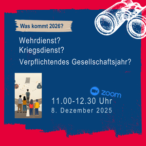 Unter dem Titel „Kriegsdienst? Wehrdienst? Verpflichtendes Gesellschaftsjahr?“ laden ELAGOT NRW und die AEJ-NRW am 8. Dezember 2025 von 11:00–12:30 Uhr zu einer digitalen Informations- und Austauschveranstaltung ein. Im Fokus stehen aktuelle Entwicklungen rund um Kriegsdienst, Wehrpflicht und Kriegsdienstverweigerung (KDV) – und ihre Bedeutung für junge Menschen und die pädagogische Praxis. Die Veranstaltung richtet sich an Engagierte in der (Offenen) Jugendarbeit sowie an alle, die junge Menschen professionell begleiten.